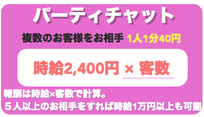 同時に沢山のお客様とチャットをする事が出来るので、人数が入ればはいる程、短時間で効率よく稼げるのがパーティーチャットの魅力です!